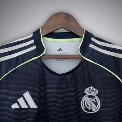25/26 Real Madrid Away Kit – A refined and modern look inspired by Madrid’s elegance and dominance. Featuring a bold color palette, lightweight performance fabric, and premium finishes. Designed for fans who carry the spirit of Los Blancos beyond the Bernabéu.