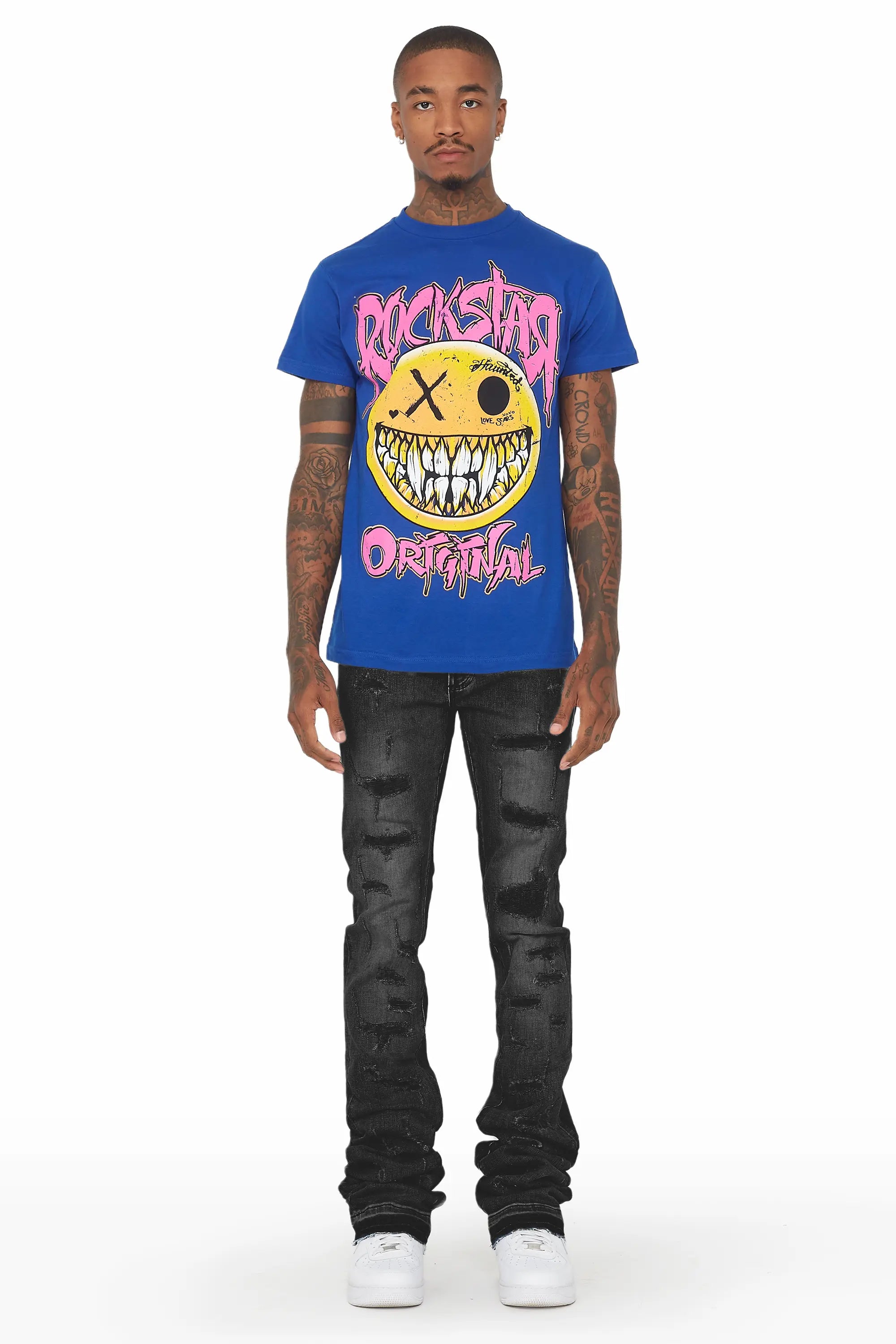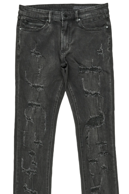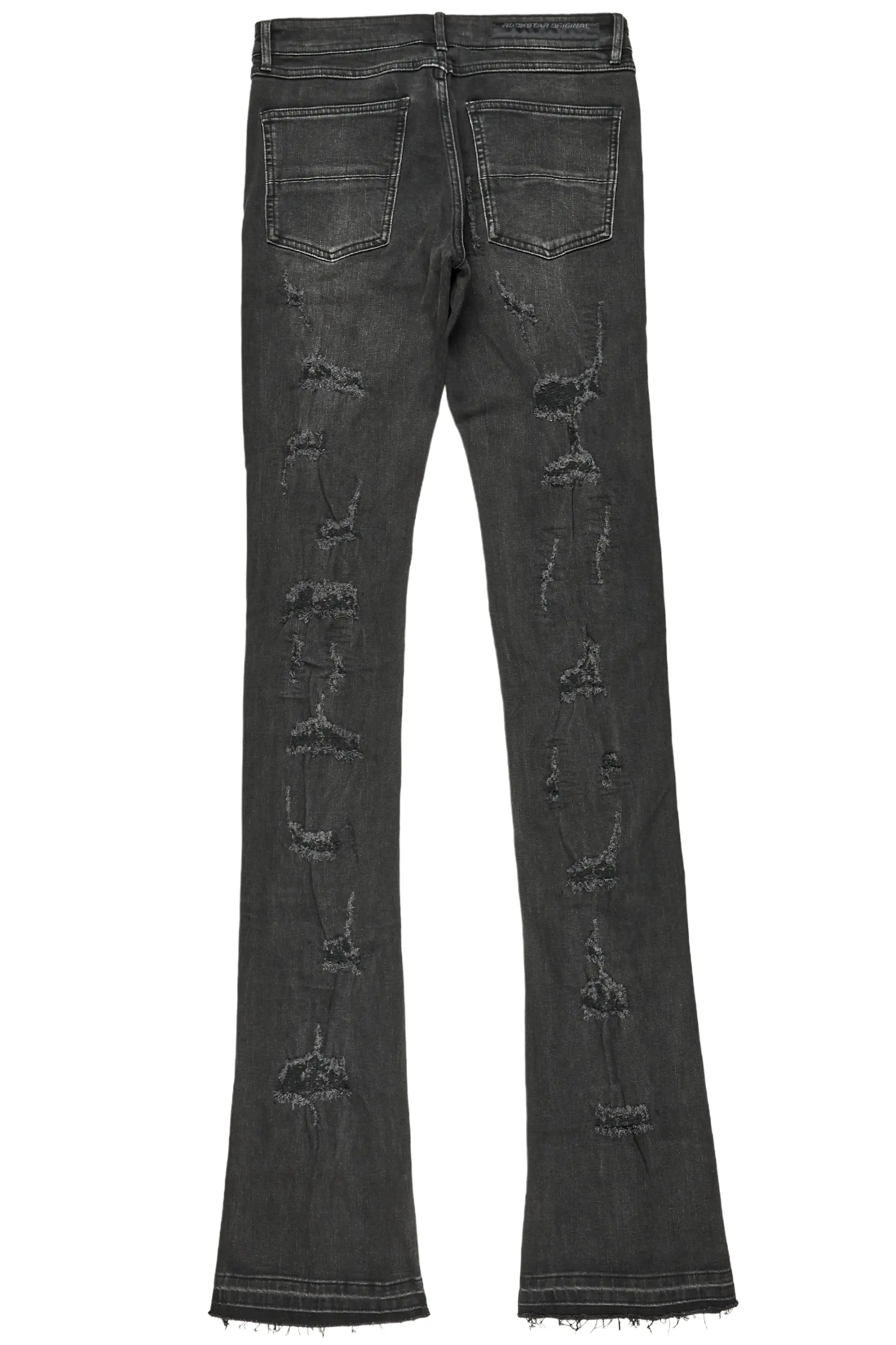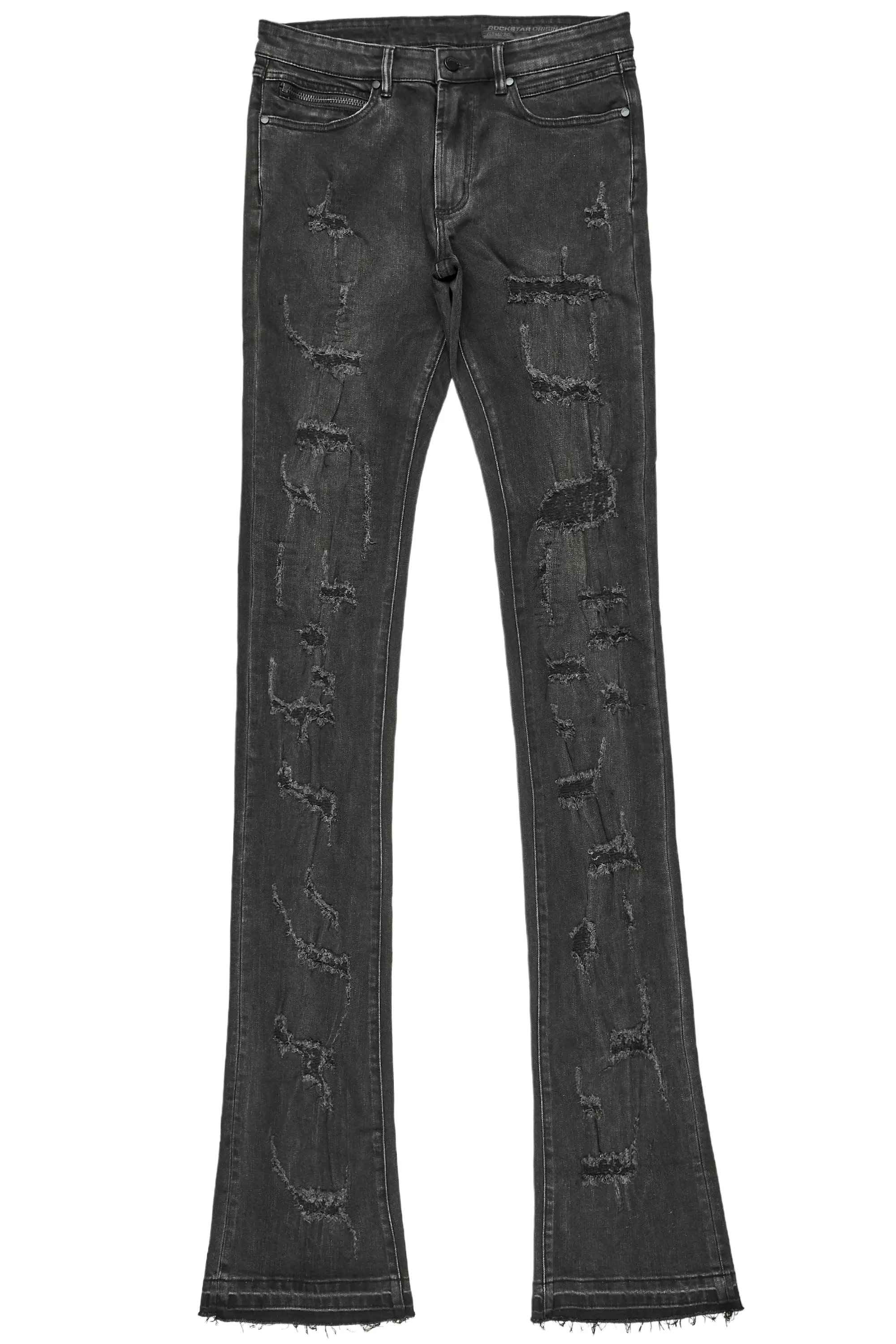 A premium urban distressed super stack denim jean for men in grey. Designed with a washed dark grey denim shade and extra long legs for a contemporary streetwear style.