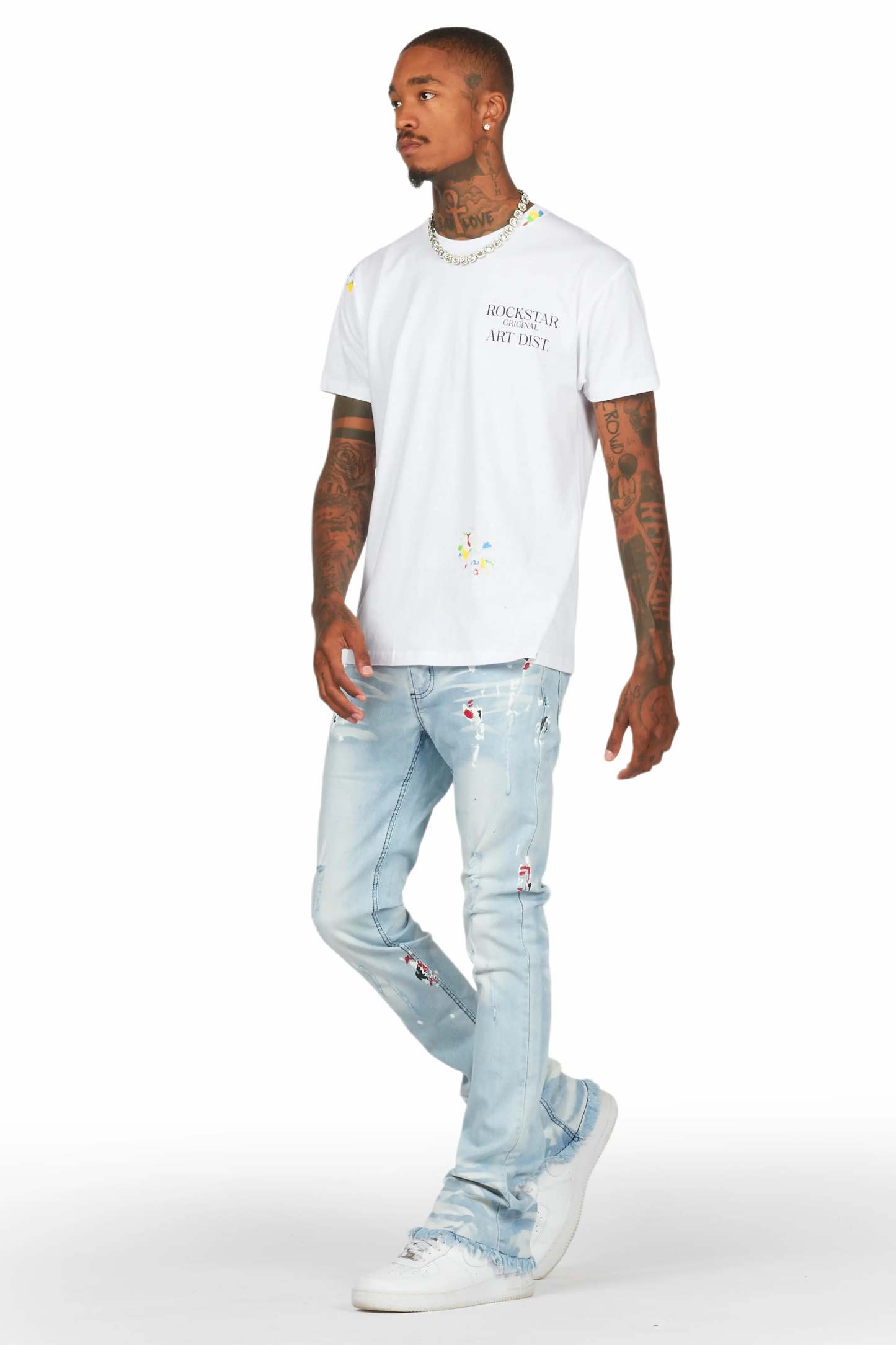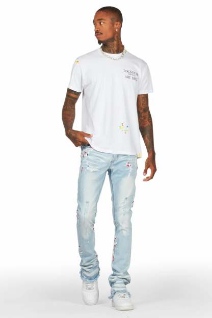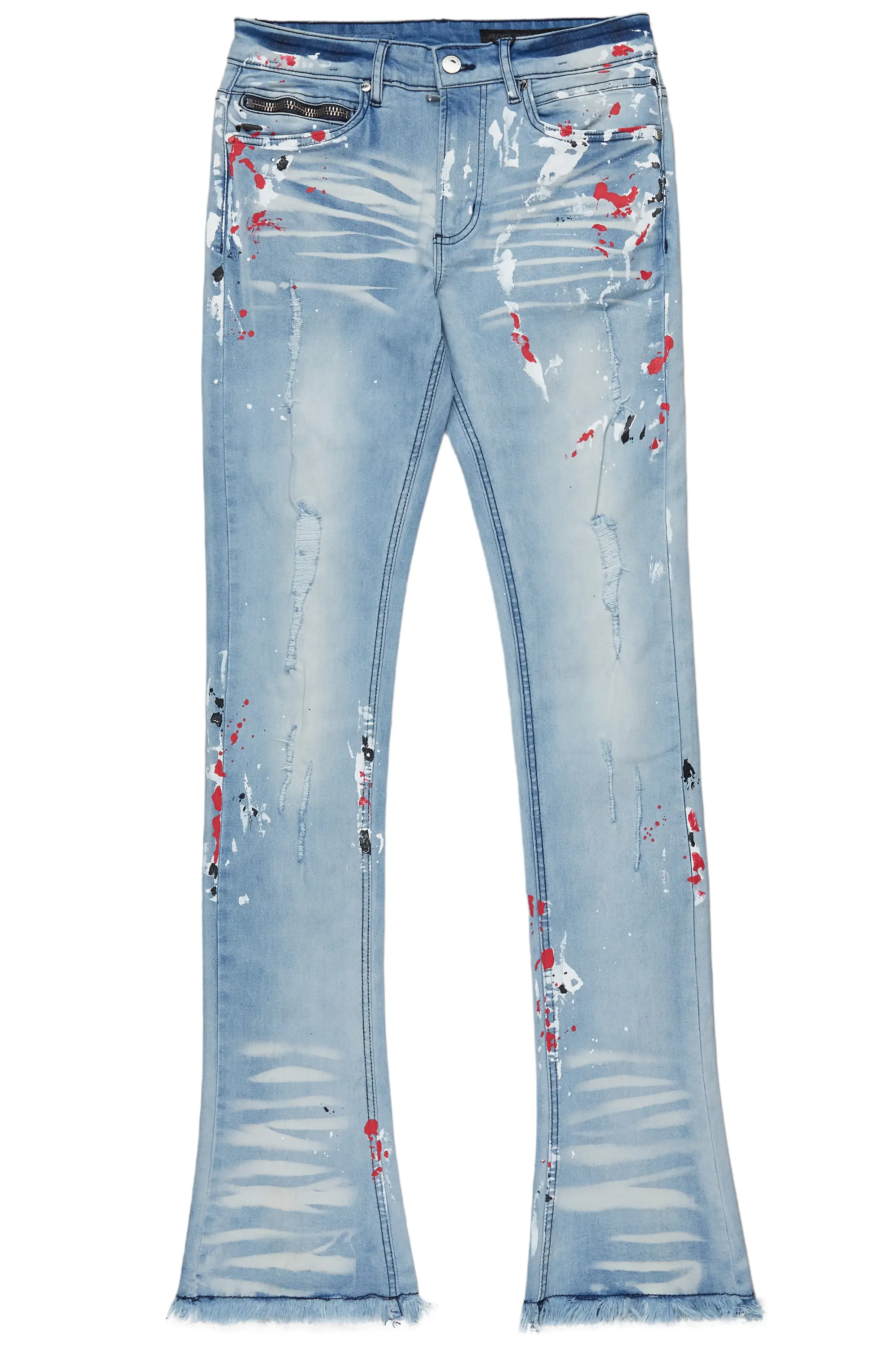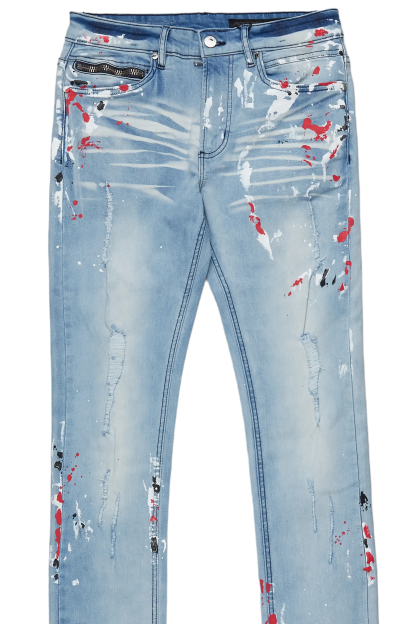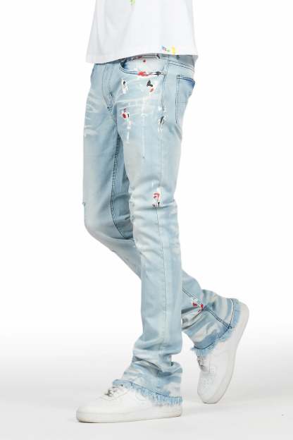 An urban stack denim jean for men in blue. Designed with organic cotton and extra long legs for an essential streetwear style.
