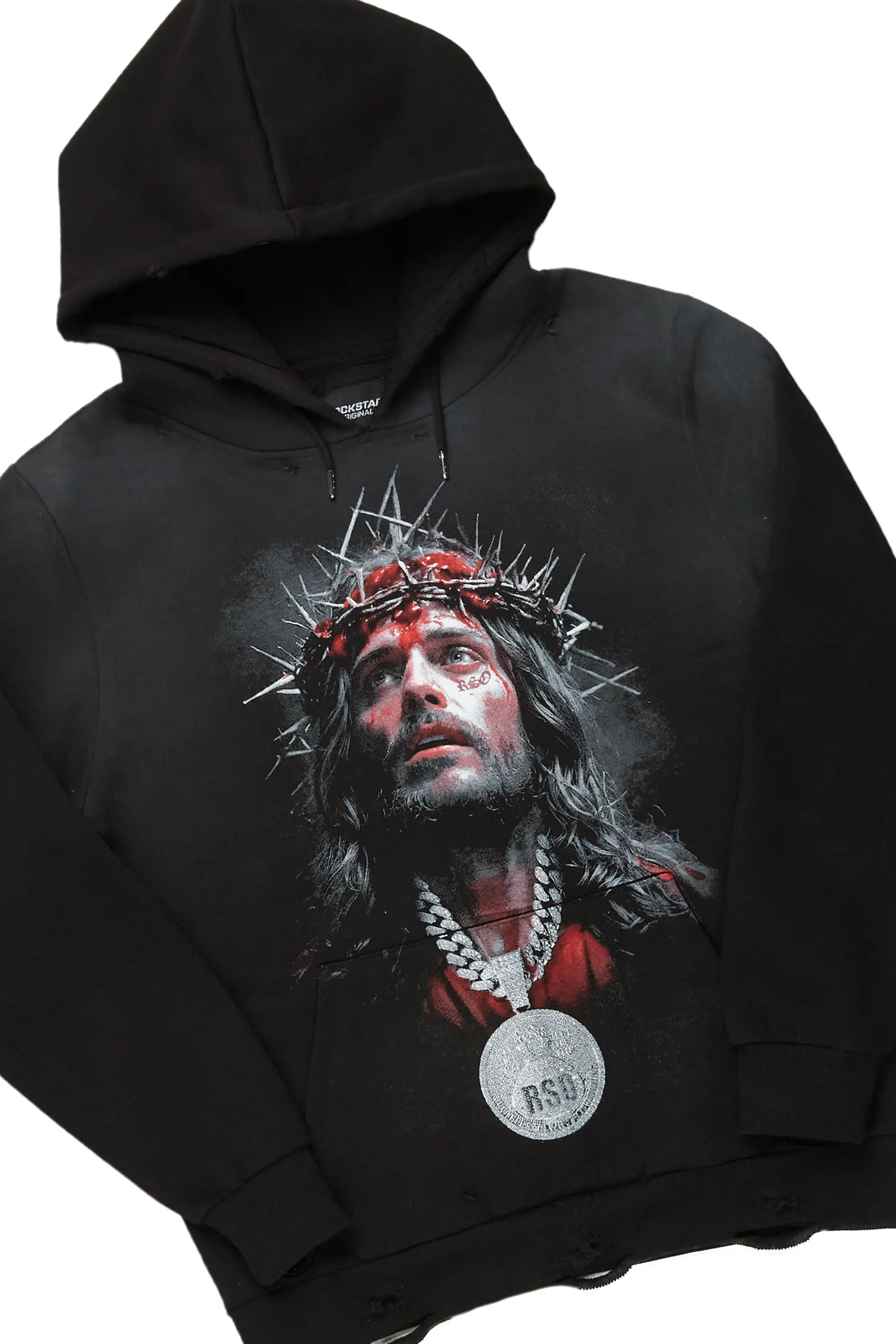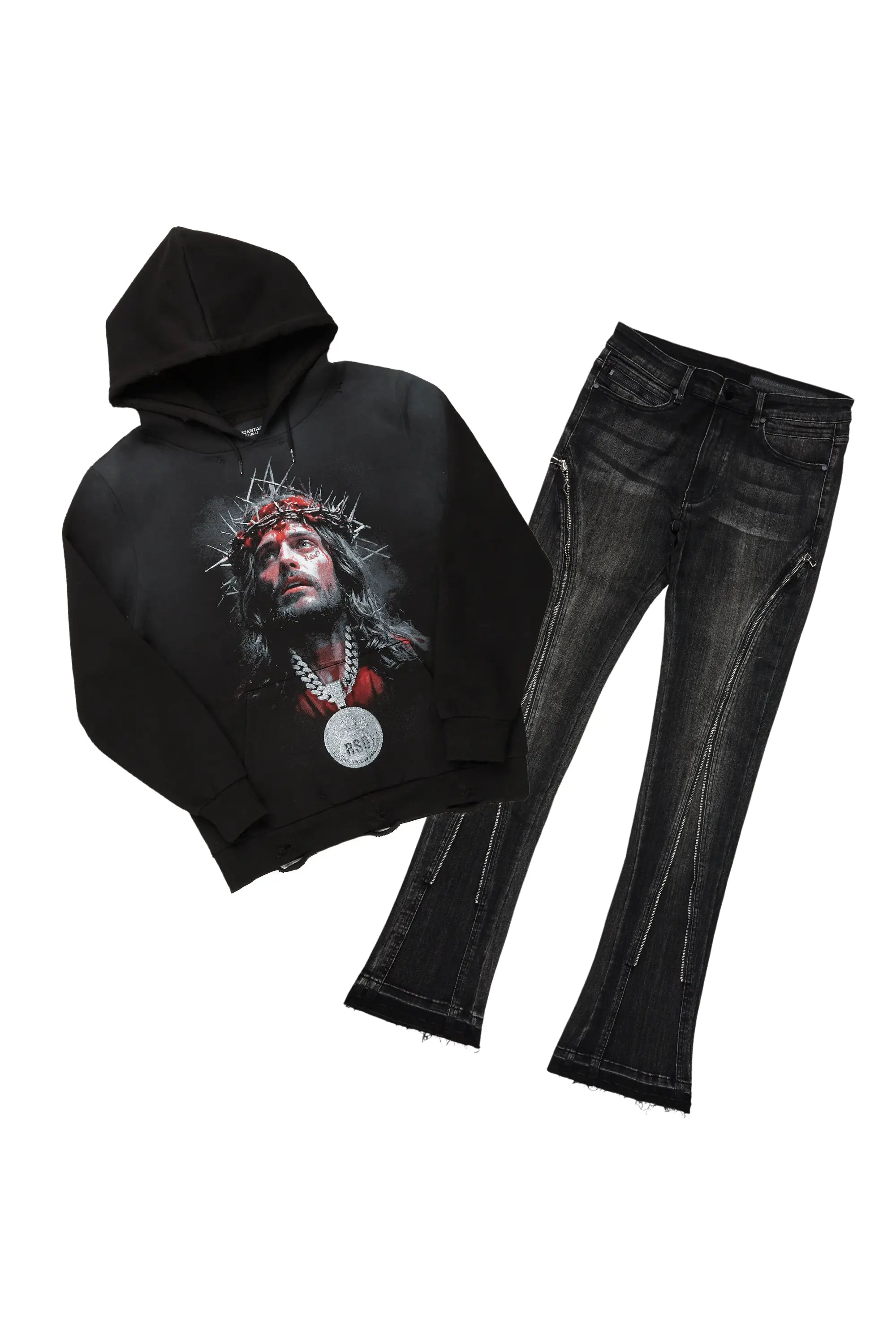 An urban two-piece graphic hoodie and stacked jean set for men. Designed with organic cotton and extra long legs for a dope streetwear outfit set.
