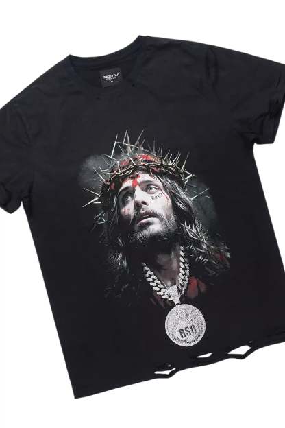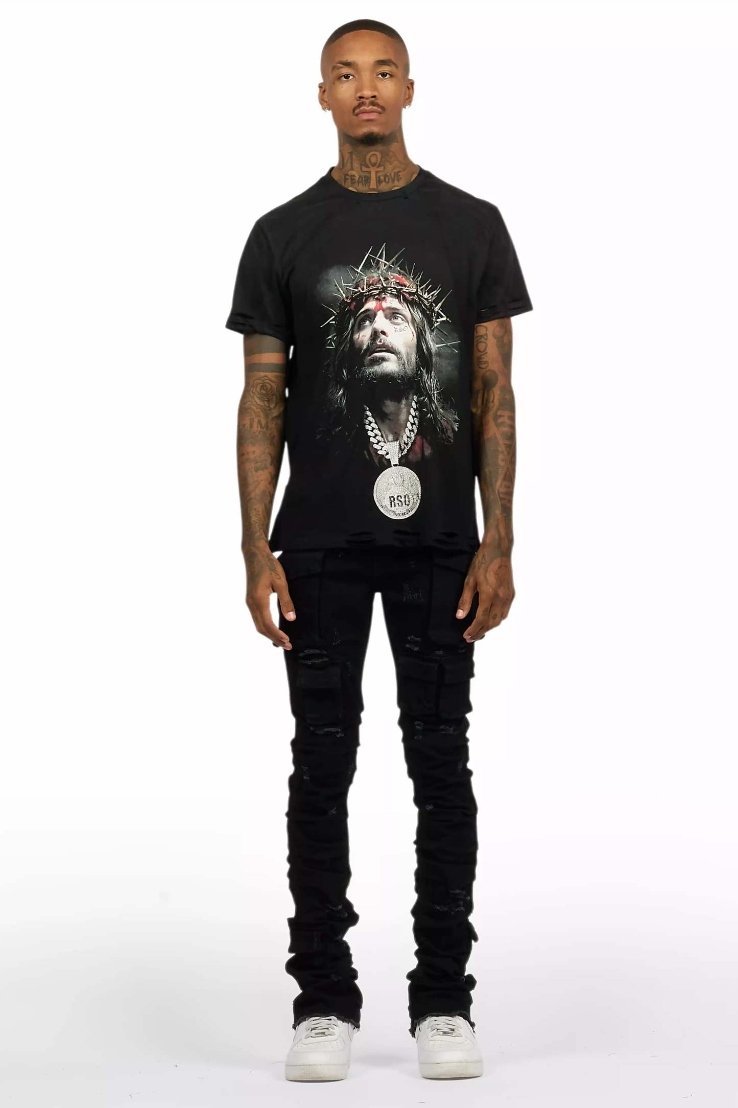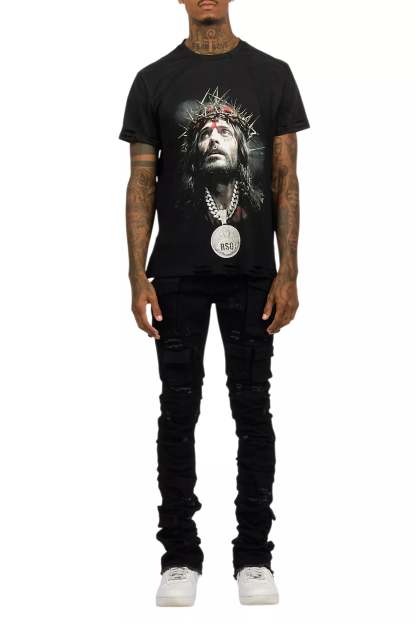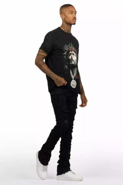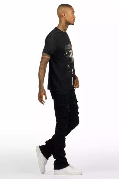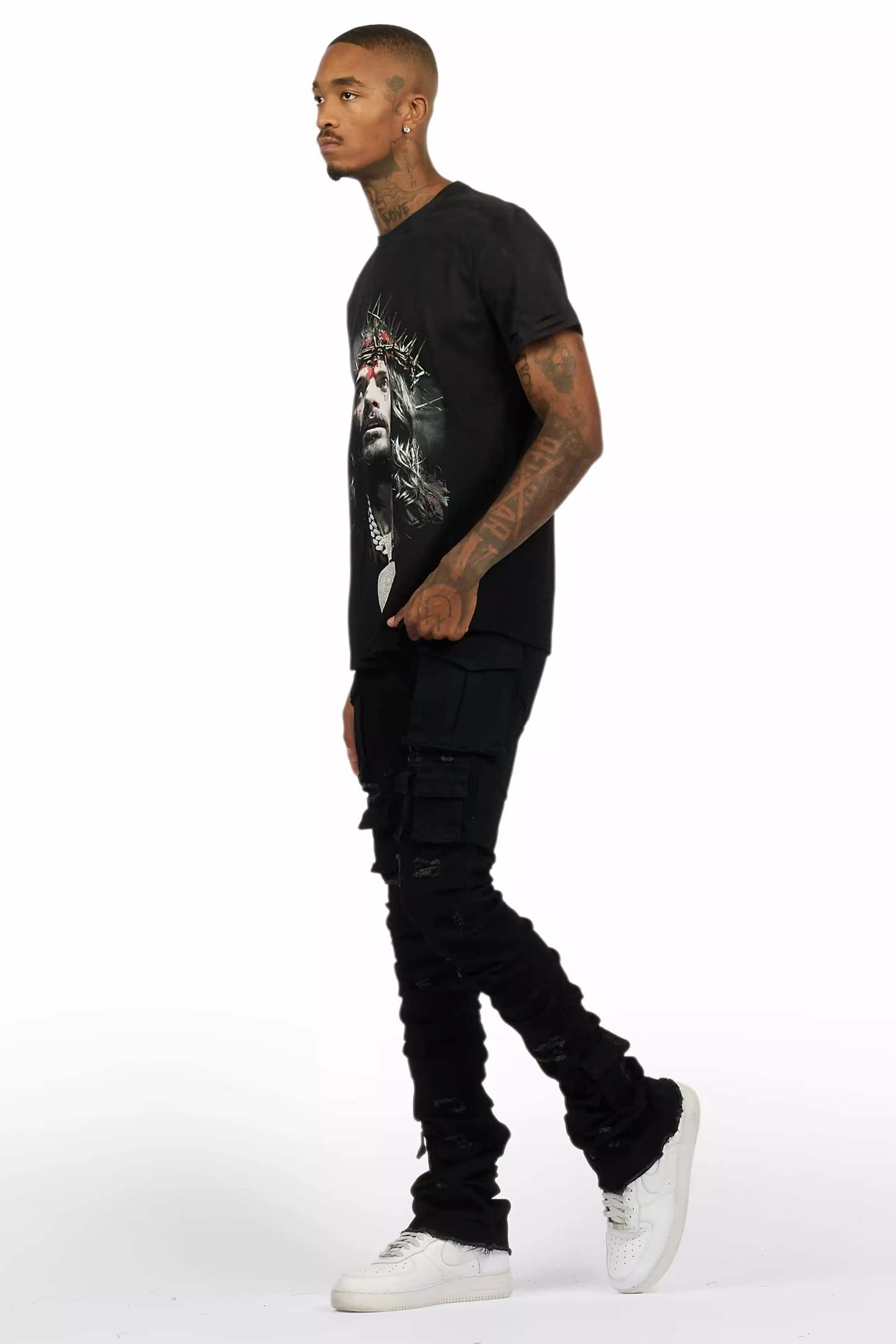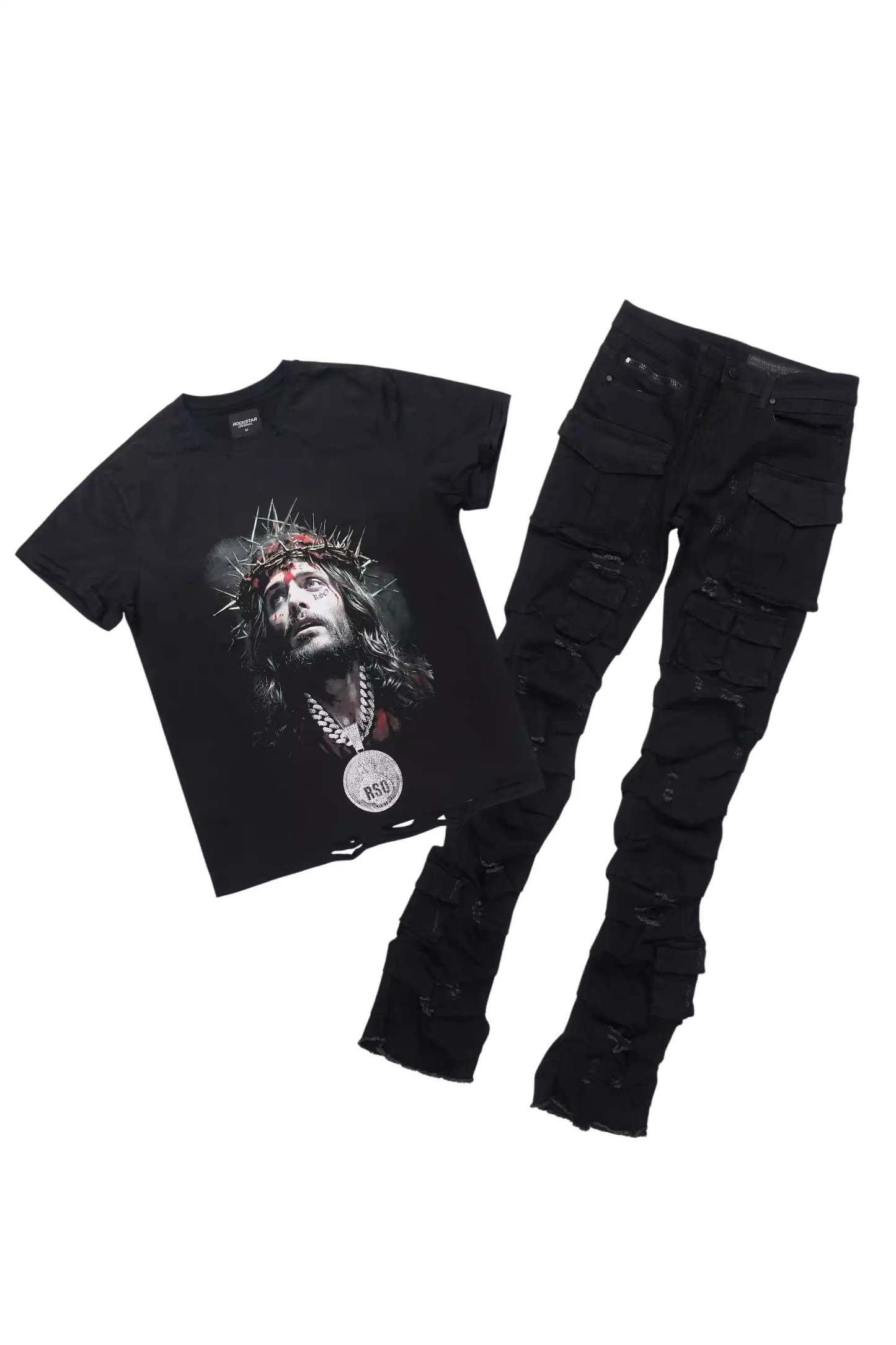 An urban two-piece graphic tee and stacked flare cargo jean set for men. Designed with organic cotton and extra long legs for a dope streetwear outfit set.